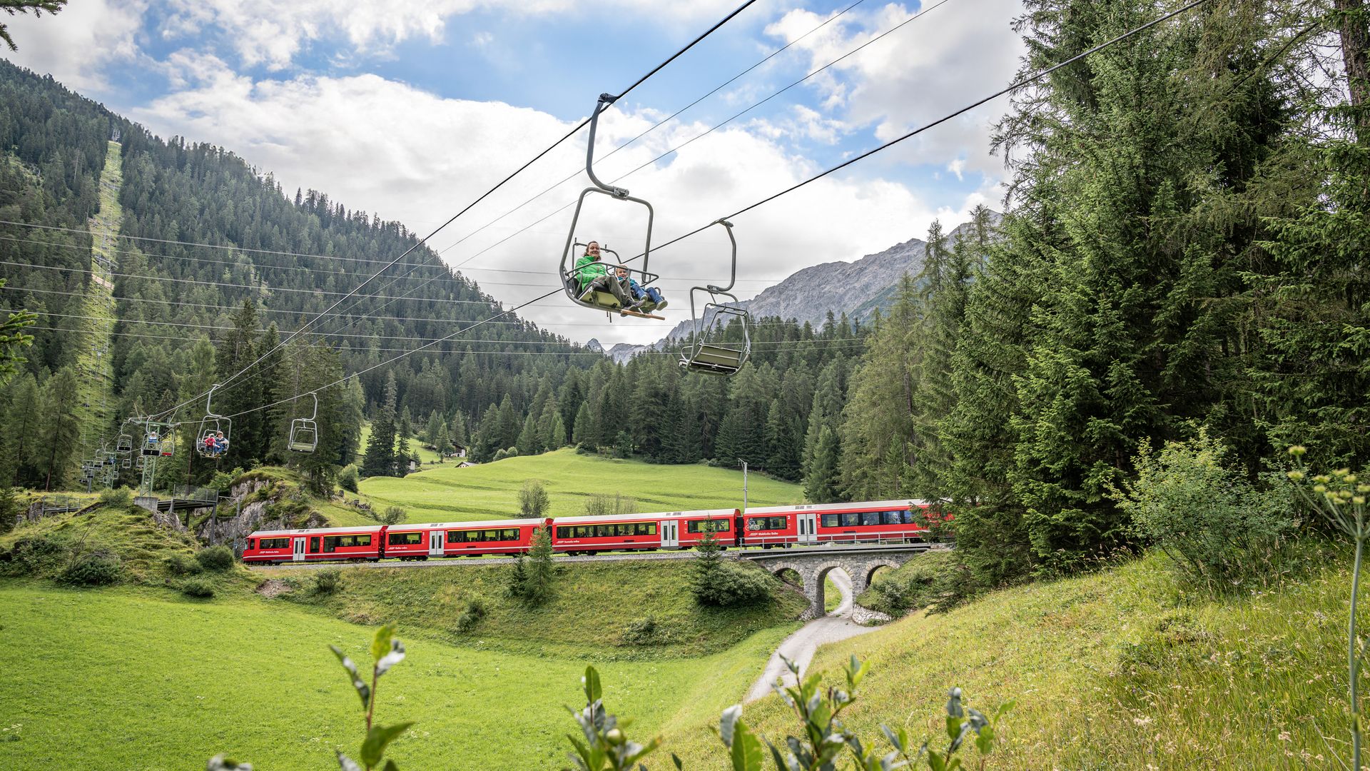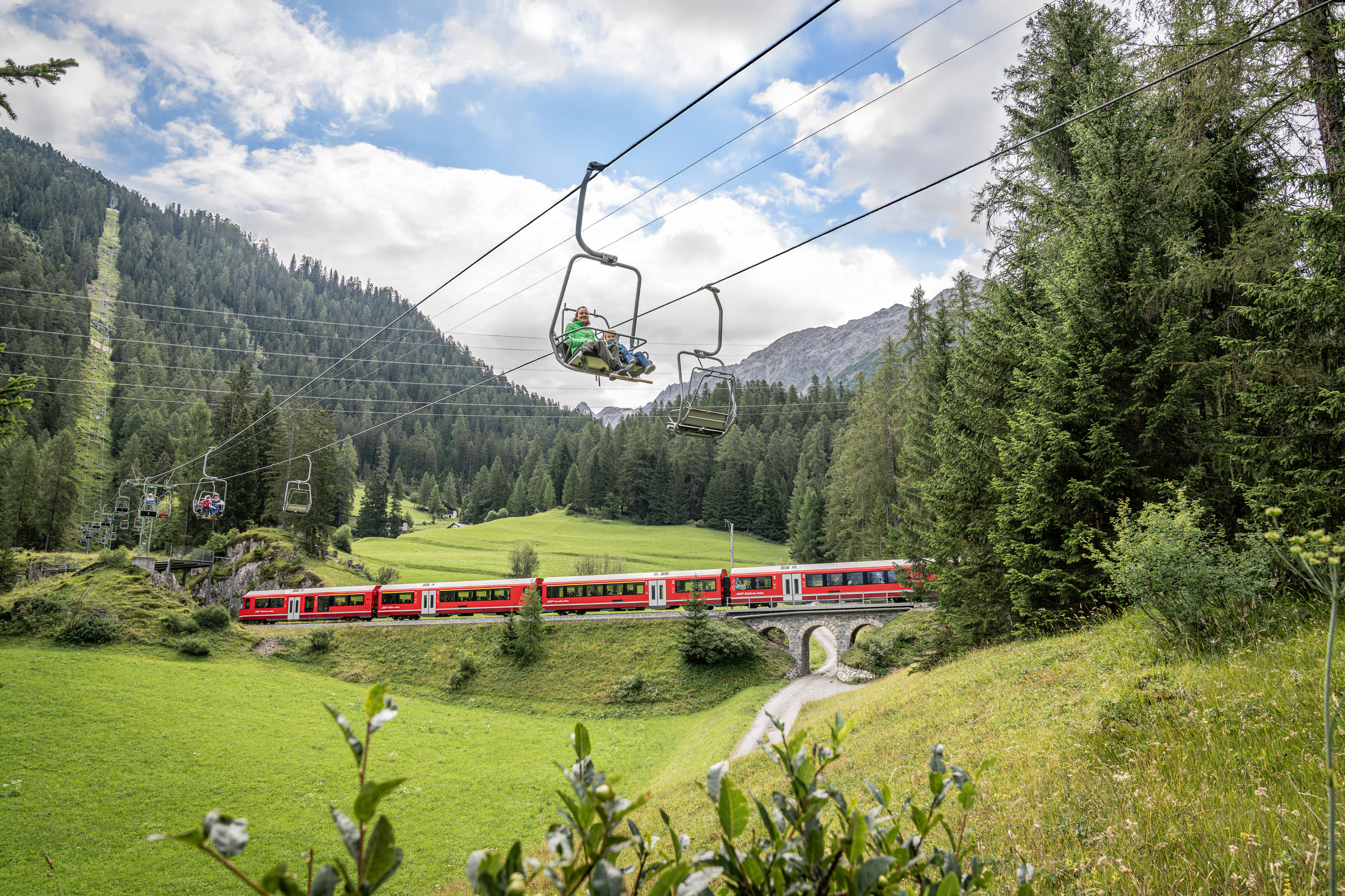 La seggiovia Darlux, che attraversa la tratta Patrimonio mondiale UNESCO, trasporta comodamente gli ospiti fino al ristorante di montagna La Diala e di nuovo a valle. Dalla stazione a monte il sentiero panoramico conduce attraverso l’Alp la Muetta fino a Chants.